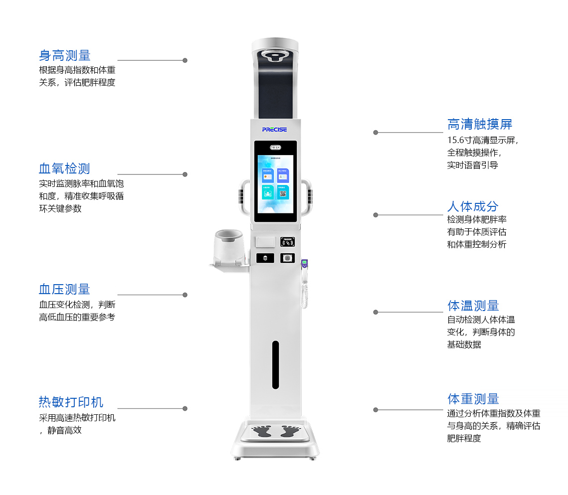 標(biāo)配功能:身高、體重、BMI、體溫、血壓、脈率、人體脂肪、血氧、視力、中醫(yī)。
